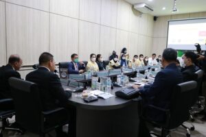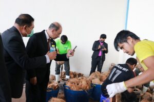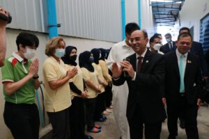 จากนั้นคณะได้ลงพื้นที่ไปยังบริษัทชายแดนใต้ฟู๊ดโพรเซสซิ่ง จำกัด ซึ่งเป็นโรงงานแปรรูปมะพร้าวแบบครบวงจร เพื่อเยี่ยมชม รับฟังการดำเนินงาน และแลกเปลี่ยนข้อมูลในการส่งเสริมอาชีพให้กับพี่น้องประชาชนในพื้นที่ ทั้งนี้ในอนาคตโรงงานแห่งนี้จะมีกำลังการผลิตอย่างเต็มรูปแบบ และจะมีกำลังการรับซื้อมะพร้าว จากเกษตรกรได้วันละกว่า 240,000 ลูก ซึ่งมีความต้องการแรงงานกว่า 100 – 200 คน เพื่อให้มีแรงงานเพียงพอ ต่อกำลังการผลิตที่จะส่งออกสู่ตลาดทั้งในต่างประเทศได้