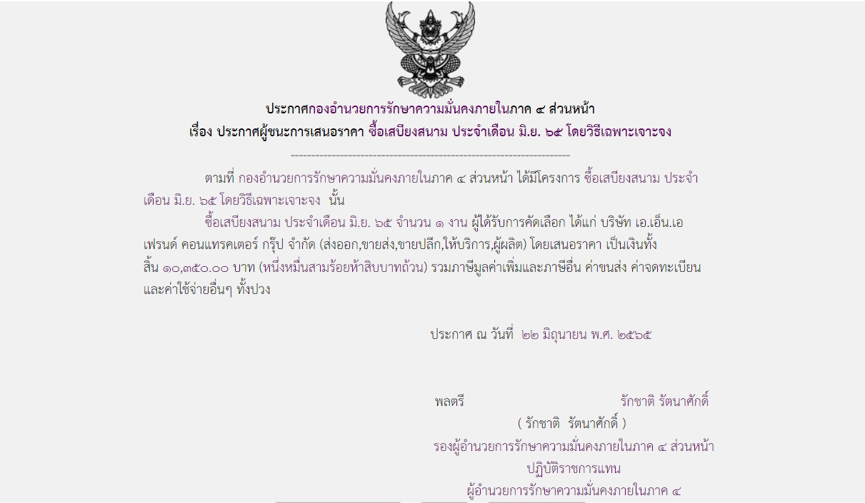 ประกาศผู้ชนะการเสนอราคา ซื้อเสบียงสนาม ประจำเดือน มิ.ย.65 โดยวิธีเฉพาะเจาะจง ( 10,350.00 บาท )