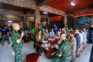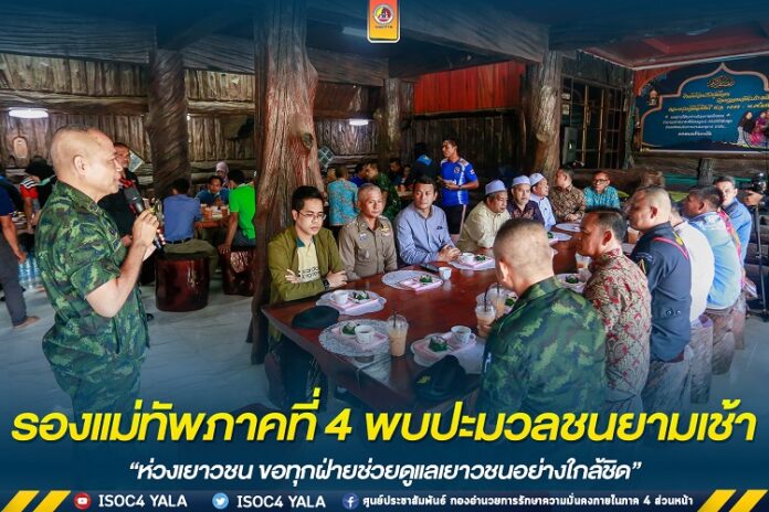 วันนี้ 2 กรกฎาคม 2565 เวลา 07.45 น. ณ ที่ทำการกำนันตำบลกาบัง หมู่ที่ 1 บ้านบันนังดามา ตำบลกาบัง อำเภอกาบัง จังหวัดยะลา พลตรี อุทิศ อนันตนานนท์ รองแม่ทัพภาคที่ 4 /รองผู้อำนวยการรักษาความมั่นคงภายในภาค 4 ส่วนหน้า พบปะมวลชนยามเช้าในพื้นที่อำเภอกาบัง เป็นการพบปะดื่มน้ำชายามเช้าในรูปแบบ “ครอบครัวกาบัง” เพื่อพูดคุยรับฟังกันและกัน พร้อมร่วมเสนอแนะข้อคิดเห็น รวมทั้งปัญหาข้อขัดข้องต่าง ๆ ภายในชุมชน เพื่อร่วมกันขับเคลื่อนในการแก้ไขปัญหาควบคู่กับการพัฒนาพื้นที่ร่วมกันของทุกฝ่าย โดยมี พลตรี ธนัช ฉิมพาลี ผู้บังคับหน่วยเฉพาะกิจยะลา , พันเอก สุรศักร ทั่วด้าว ผู้บังคับหน่วยเฉพาะกิจกรมทหารพรานที่ 47 นายอัมรันท์ บากา นายอำเภอกาบัง พร้อมด้วยผู้นำท้องที่ ผู้นำท้องถิ่น ผู้นำศาสนา ทหาร ตำรวจ ฝ่ายปกครอง และประชาชนในพื้นที่ ร่วมพบปะในครั้งนี้