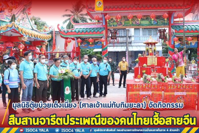 วันนี้ (8 กรกฎาคม 2565) มูลนิธิตุ้ยบ๋วยเต็งเนี่ยง (ศาลเจ้าแม่ทับทิมยะลา) ร่วมกับ องค์การบริหารส่วนจังหวัดยะลา เทศบาลนครยะลา และ กองอำนวยการรักษาความมั่นคงภายในจังหวัดยะลา จัดกิจกรรมสืบสานจารีตประเพณีของคนไทยเชื้อสายจีนประจำปีงบประมาณ 2565 ซึ่งมี นายอำนาจ ชูทอง รองผู้ว่าราชการจังหวัดยะลา เป็นประธานในพิธีฯ โดยมี พันเอก ประเสริฐศักดิ์ แก้วคำ รองเสนาธิการหน่วยเฉพาะกิจยะลา, พันเอก สุชาญ วิจิตรจินดา หัวหน้ากลุ่มงานกิจการมวลชน กองอำนวยการรักษาความมั่นคงภายในจังหวัดยะลา, ผู้แทนองค์การบริหารส่วนจังหวัดยะลา, ประธานมูลนิธิตุ้ยบ๋วยเต็งเนี่ยง, คณะกรรมการมูลนิธิตุ้ยบ๋วยเต็งเนี่ยง, หัวหน้าส่วนราชการ, และชาวไทยเชื้อสายจีนในพื้นที่เข้าร่วมพิธี ณ ศาลเจ้าแม่ทับทิม จังหวัดยะลา
