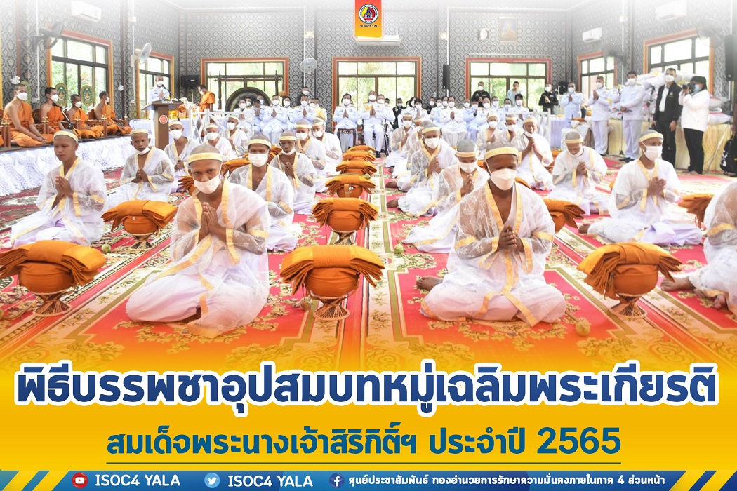 ทั้งนี้ กองอำนวยการรักษาความมั่นคงภายในภาค 4 ส่วนหน้า โดยศูนย์ประสานงานโครงการอันเนื่องมาจากพระราชดำริ ได้กำหนดจัดพิธีบรรพชาอุปสมบทหมู่เฉลิมพระเกียรติ สมเด็จพระนางเจ้าสิริกิติ์ พระบรมราชินีนาถ พระบรมราชชนนีพันปีหลวง ประจำปี 2565 ในพื้นที่ 3 จังหวัดชายแดนภาคใต้ และ 4 อำเภอของจังหวัดสงขลา ตามพระราชเสาวนีย์สมเด็จพระนางเจ้าสิริกิติ์ พระบรมราชินีนาถ พระบรมราชชนนีพันปีหลวง ที่ทรงมีพระราชปณิธานอันแน่วแน่ ในการทำนุบำรุงพระพุทธศาสนาให้ดำรงคงมั่นอยู่ในพื้นที่เป็นที่พึ่งทางใจของชาวไทยที่นับถือพระพุทธศาสนา ตลอดจนถวายเป็นพระราชกุศลแด่พระบาทสมเด็จพระปรเมนทร รามาธิบดี ศรีสินทร มหาวชิราลงกรณ พระวชิรเกล้าเจ้าอยู่หัว สมเด็จพระนางเจ้าสิริกิติ์ พระบรมราชินีนาถ พระบรมราชชนนีพันปีหลวง และสมเด็จพระนางเจ้าสุทิดา พัชรสุธาพิมลลักษณ พระบรมราชินี รวมทั้งให้วัด สำนักสงฆ์ และพระสงฆ์ สามารถดำรงสภาพอยู่ได้ พระสงฆ์ไม่ทิ้งวัดสามารถปฏิบัติศาสนกิจได้ และให้ผู้มีจิตศรัทธาที่เข้าร่วมอุปสมบทจำพรรษาได้ประกอบพิธีกรรมทางพระพุทธศาสนา ทดแทนพระคุณบุพการี ผู้มีอุปการะคุณ และศึกษาเรียนรู้หลักธรรมคำสอนตามหลักศาสนา