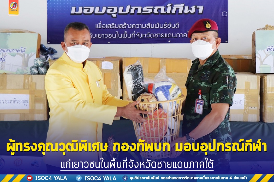 การส่งมอบอุปกรณ์กีฬาให้แก่โรงเรียนในพื้นที่จังหวัดชายแดนภาคใต้ โดยผ่านกองพลทหารราบที่ 15 และหน่วยเฉพาะกิจสันติสุข หวังให้กีฬาเป็นส่วนหนึ่งในการพัฒนาเยาวชนผ่านการเล่นกีฬา เพราะการเล่นกีฬาออกกำลังกายจะช่วยให้มีสุขภายร่างกายแข็งแรง อีกทั้งยังเป็นการปลูกฝังเยาวชนในเรื่องความรัก ความสามัคคี รู้แพ้ รู้ชนะ รู้อภัย และสามารถเรียนรู้ เข้าใจ ซึ่งกันและกันมากยิ่งขึ้น เสริมสร้างร่างกายให้แข็งแรง รู้จักใช้เวลาว่างให้เป็นประโยชน์ ปลอดภัยและห่างไกลจากยาเสพติด โดยให้หน่วยทหารในพื้นที่ช่วยส่งเสริมเติมเต็มเพื่อเพิ่มทักษะด้านกีฬาอก่เยาวชนให้หันมาเล่นกีฬา เพื่อให้เยาวชนมีสุขภาพร่างกายแข็งแรงมีสุขภาวะที่ดีและสร้างแรงบันดาลใจในการเป็นนักกีฬามืออาชีพต่อไป