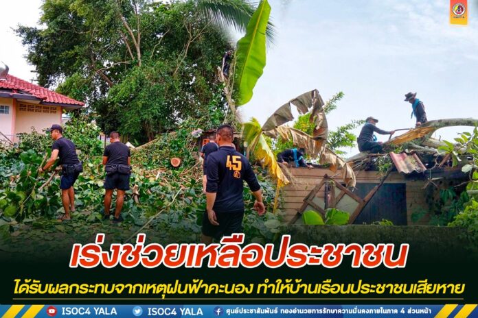 หน่วยเฉพาะกิจกรมทหารพรานที่ 45 นำกำลังพลชุดปฏิบัติการเสริมสร้างความเข้าใจ พร้อมเครื่องมืออุปกรณ์ เพื่อเร่งดำเนินการช่วยเหลือประชาชนที่ได้รับผลกระทบจากเหตุพายุฝนฟ้าคะนอง ลมกรรโชกพัดแรง เป็นเหตุให้มีบ้านเรือนราษฎรได้รับความเสียหายจำนวนหลายหลังคาเรือนในพื้นที่อำเภอระแงะ จังหวัดนราธิวาส โดยเจ้าหน้าที่ได้สำรวจความเสียหายในขั้นต้น พบว่ามีบ้านเรือนของประชาชนในพื้นที่ได้รับความเสียหายจากลมกรรโชกพัดแรงและต้นไม้ล้มทับบ้านเรือน โดยเจ้าหน้าที่ได้ให้การช่วยเหลือในการตัดต้นไม้ที่ล้มทับหลังคา และช่วยซ่อมแซมกระเบื้องหลังคาบ้านเรือนประชาชนให้กลับคืนสภาพปกติ เพื่อไม่ให้ประชาชนได้รับความเดือดร้อน หากมีฝนตกลงมาเพิ่มอีกในพื้นที่ ซึ่งประชาชนรู้สึกปลาบปลื้มใจ และขอบคุณเจ้าหน้าที่ทหารที่ให้การช่วยเหลือ และไม่ทอดทิ้งประชาชน
