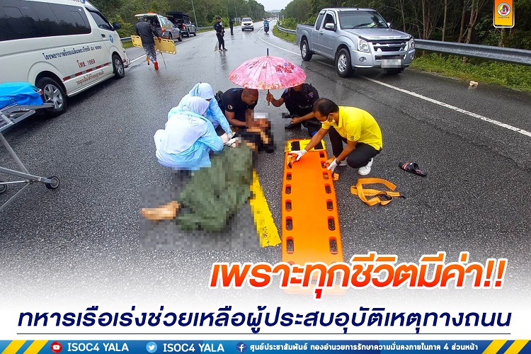 เมื่อวันที่ 12 กรกฎาคม 2565 ช่วงเวลาประมาณ 11.30 น. กองร้อยทหารพรานนาวิกโยธินที่ 6 หน่วยเฉพาะกิจนาวิกโยธินกองทัพเรือ ได้รับแจ้งจากประชาชนว่า มีผู้ประสบอุบัติเหตุ ที่บริเวณถนนทางขึ้นเขายือราแป บ้านบลูกาสนอ ตำบลตะปอเยาะ อำเภอยี่งอ จังหวัดนราธิวาส เมื่อได้รับแจ้งดังกล่าวจึงได้ส่งกำลังพลเร่งเข้าให้การช่วยเหลือผู้ประสบอุบัติเหตุทันที เมื่อไปถึงที่เกิดเหตุ พบผู้ประสบอุบัติเหตุได้บาดเจ็บอาการสาหัส (แขนขวาหักสามท่อน มีกระดูกแทงทะลุบาดแผล) จึงได้ทำการปฐมพยาบาลเบื้องต้นให้แก่ผู้บาดเจ็บโดยทันที ก่อนเตรียมส่งผู้ประสบอุบัติเหตุรับการรักษาต่อไป