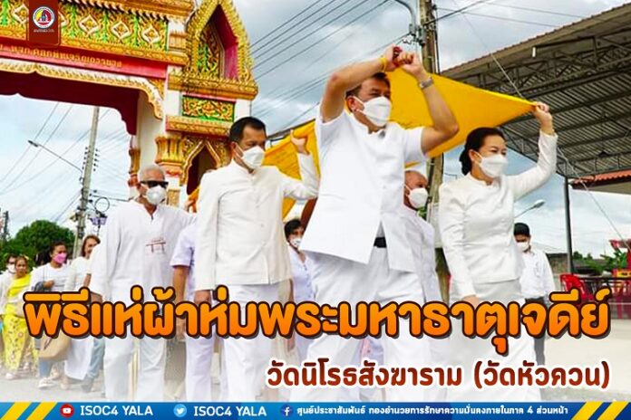 เมื่อวันที่ 13 กรกฎาคม 2565 เวลา 16.00 น. ที่พระมหาธาตุเจดีย์ วัดนิโรธสังฆาราม (วัดหัวควน) อำเภอเมือง จังหวัดยะลา นายภิรมย์ นิลทยา ผู้ว่าราชการจังหวัดยะลา ร่วมกับพุทธศาสนิกชนในพื้นที่จังหวัดยะลา แห่ผ้าห่มพระมหาธาตุเจดีย์ วัดนิโรธสังฆาราม (วัดหัวควน) เนื่องในวันอาสาฬหบูชา เพื่อให้พุทธศาสนิกชนในพื้นที่จังหวัดยะลา ได้ร่วมแห่ผ้าขึ้นห่มพระมหาเจดีย์ธาตุ ถวายเป็นพุทธบูชา แสดงออกถึงความศรัทธาในพระพุทธศาสนา อนุรักษ์สืบสานประเพณีทางพุทธศาสนาให้คงอยู่สืบไป รวมทั้งปลูกฝังให้เยาวชน ประชาชนได้นำหลักธรรมไปปฏิบัติ