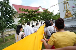 สำหรับประเพณีทางพระพุทธศาสนา การแห่ผ้าห่มพระมหาธาตุเจดีย์ เป็นการแสดงออกถึงความศรัทธาในพระพุทธศาสนา เปรียบได้กับการถวายผ้าไตรแก่พระพุทธเจ้า โดยทางวัดนิโรธสังฆาราม โดยพระโสภณธรรมนุณี ดร. เจ้าอาวาสวัดนิโรธสังฆาราม/รองเจ้าคณะจังหวัดยะลา ได้มีการให้พุทธศาสนิกชน ผู้มีจิตศรัทธา ได้ร่วมอนุโมทนาบุญ โดยการเขียนชื่อของตนเอง ครอบครัว ลงในผืนผ้า เพื่อให้ประชาชน พุทธศาสนิกชน ได้สักการะบูชา เพื่อความเป็นสิริมงคลแก่ตนเองและครอบครัว