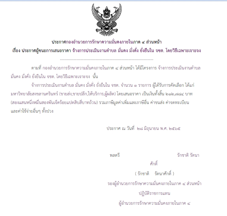 ประกาศผู้ชนะการเสนอราคา จ้างการประเมินงานตำบล มั่นคง มั่งคั่ง ยั่งยืนใน จชต. โดยวิธีเฉพาะเจาะจง