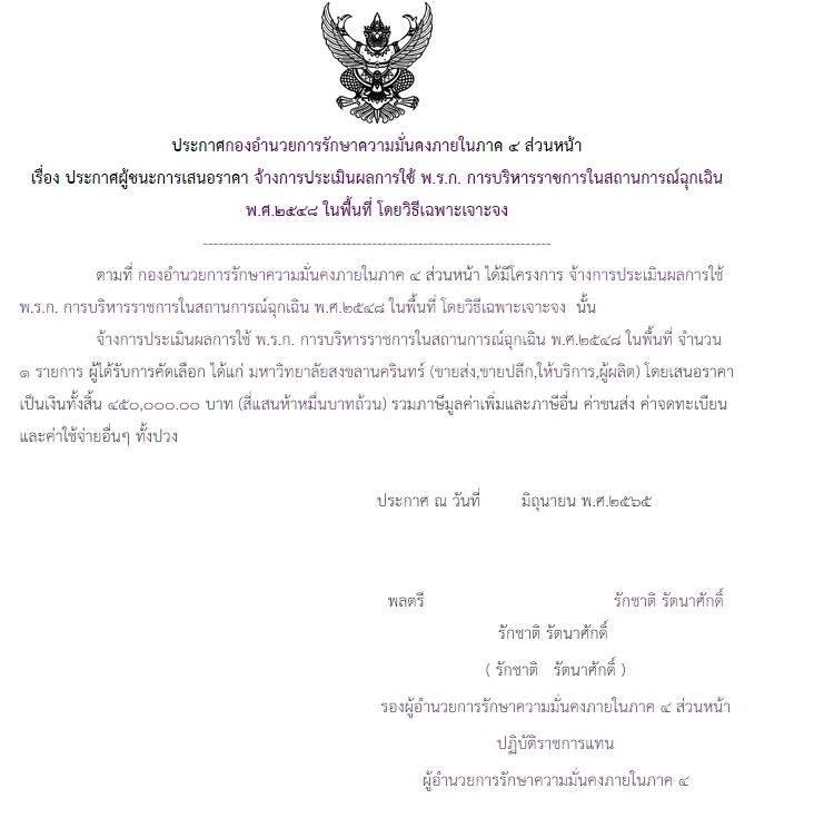 จัดซื้อ จัดจ้างประกาศผู้ชนะการเสนอราคา ประกาศผู้ชนะการเสนอราคา จ้างการประเมินผลการใช้ พ.ร.ก. การบริหารราชการในสถานการณ์ฉุกเฉิน พ.ศ.๒๕๔๘ โดยวิธีเฉพาะเจาะจง July 16, 2022 404 Share Facebook Twitter Google+ Telegram LINE