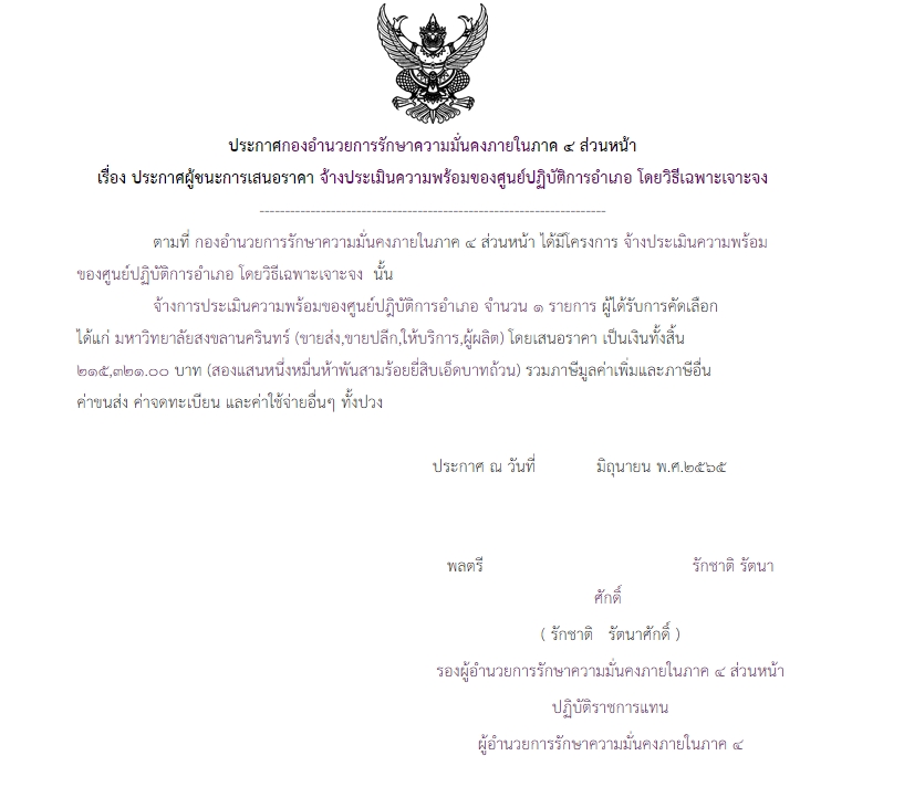 ประกาศผู้ชนะการเสนอราคา จ้างการประเมินความพร้อมของศูนย์ปฏิบัติการอำเภอ โดยวิธีเฉพาะเจาะจง
