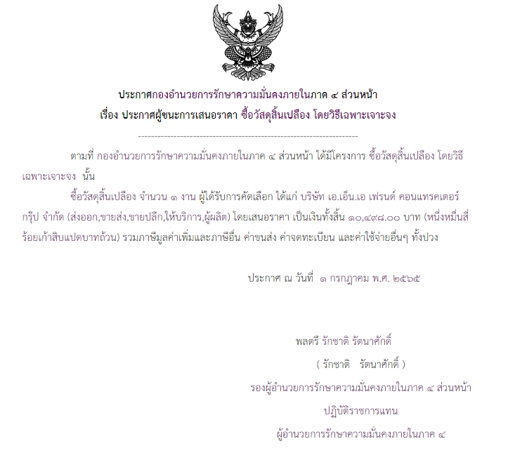 ประกาศผู้ชนะการเสนอราคา ซื้อวัสดุสิ้นเปลือง โดยวิธีเฉพาะเจาะจง