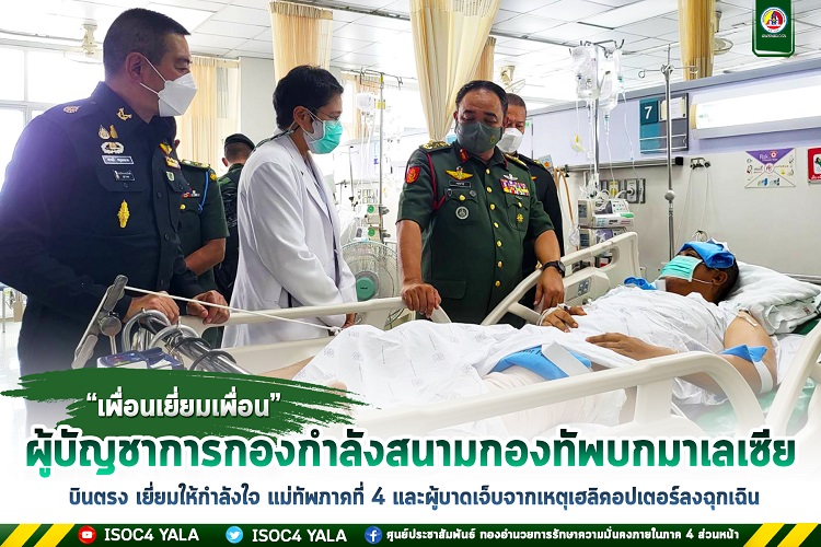 วันนี้ 17 กรกฎาคม 2565 เวลา 10.30 น. ที่ โรงพยาบาลสงขลานครินทร์ อำเภอหาดใหญ่ จังหวัดสงขลา พลโท ดาโต๊ะ ฮัจญี ฮาฟิส ซูฟิเดอีน บิน จานทาน ผู้บัญชาการกองกำลังสนามกองทัพบก ภาคพื้นตะวันตก และคณะ เป็นผู้แทน พลเอก ตัน สรี ดาโต๊ะ เซอรี ซัมโรส บินโมฮัมหมัด ซาอิน ผู้บัญชาการทหารบกมาเลเซีย เข้าเยี่ยมให้กำลังใจ พลโท เกรียงไกร ศรีรักษ์ แม่ทัพภาคที่ 4/ประธานคณะกรรมการชายแดนส่วนภูมิภาคร่วม ไทย-มาเลเซีย และเจ้าหน้าที่ นายทหารดูแล นักบิน ช่างเครื่อง ช่างภาพที่ได้รับบาดเจ็บ จากเหตุเฮลิคอปเตอร์ ลงจอดฉุกเฉินในพื้นที่ ตำบลวังใหญ่ อำเภอเทพา จังหวัดสงขลา ในระหว่างปฏิบัติภารกิจเดินทางจากค่ายเสนาณรงค์ อำเภอหาดใหญ่ จังหวัดสงขลา เมื่อวันที่ 15 กรกฎาคมที่ผ่านมา โดยมี พลตรี ศานติ ศกุนตนาค รองแม่ทัพภาคที่ 4 พลตรี สิรภพ ศุภวานิช ผู้บัญชาการกองพลพัฒนาที่ 4 ร่วมให้การต้อนรับ