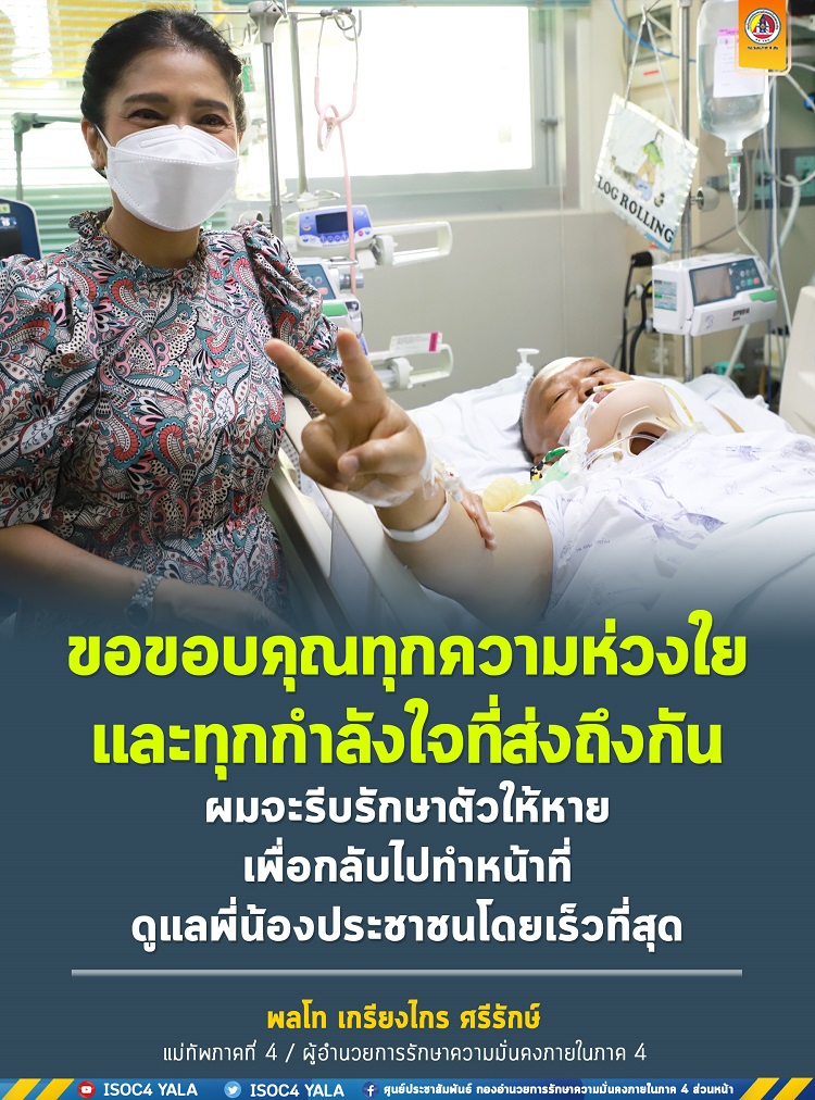 ประชาสัมพันธ์ข่าวประชาสัมพันธ์ ขอขอบคุณทุกความห่วงใย และทุกกำลังใจที่ส่งถึงกัน ผมจะรีบรักษาตัวให้หาย เพื่อกลับไปทำหน้าที่ ดูแลพี่น้องประชาชนโดยเร็วที่สุด July 17, 2022 1801 Share Facebook Twitter Google+ Telegram LINE พลโท เกรียงไกร ศรีรักษ์ แม่ทัพภาคที่ 4 / ผู้อำนวยการรักษาความมั่นคงภายในภาค 4 ศูนย์ประชาสัมพันธ์กองอำนวยการรักษาความมั่นคงภายในภาค4ส่วนหน้า