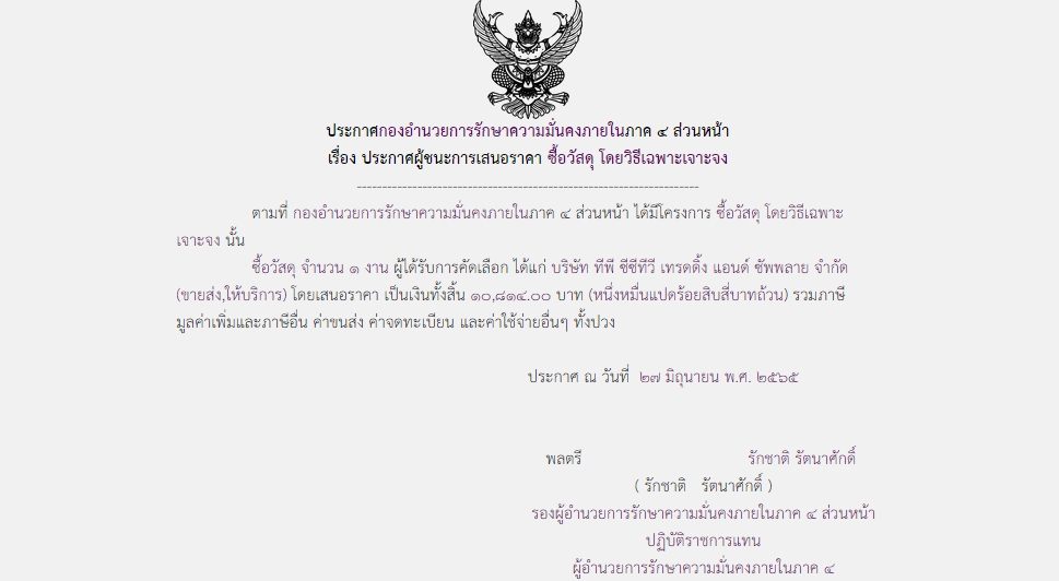 ประกาศผู้ชนะการเสนอราคา ซื้อวัสดุ โดยวิธีเฉพาะเจาะจง