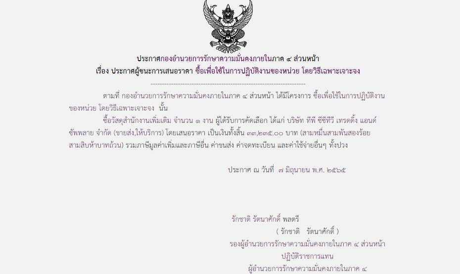จัดซื้อ จัดจ้างประกาศผู้ชนะการเสนอราคา ประกาศผู้ชนะการเสนอราคา ซื้อเพื่อใช้ในการปฏิบัติงานของหน่วย โดยวิธีเฉพาะเจาะจง July 18, 2022 361 Share Facebook Twitter Google+ Telegram LINE