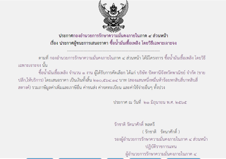 ประกาศผู้ชนะการเสนอราคา ซื้อน้ำมันเชื้อเพลิง โดยวิธีเฉพาะเจาะจง