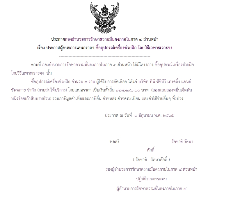 ประกาศผู้ชนะการเสนอราคา ซื้ออุปกรณ์เครื่องช่วยฝึก โดยวิธีเฉพาะเจาะจง