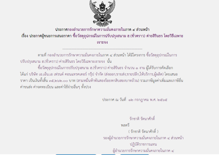 จัดซื้อ จัดจ้างประกาศผู้ชนะการเสนอราคา ประกาศผู้ชนะการเสนอราคา ซื้อวัสดุอุปกรณ์ในการปรับปรุงสนาม ฮ.(ชั่วคราว) ค่ายสิรินธร โดยวิธีเฉพาะเจาะจง July 23, 2022 636 Share Facebook Twitter Google+ Telegram LINE