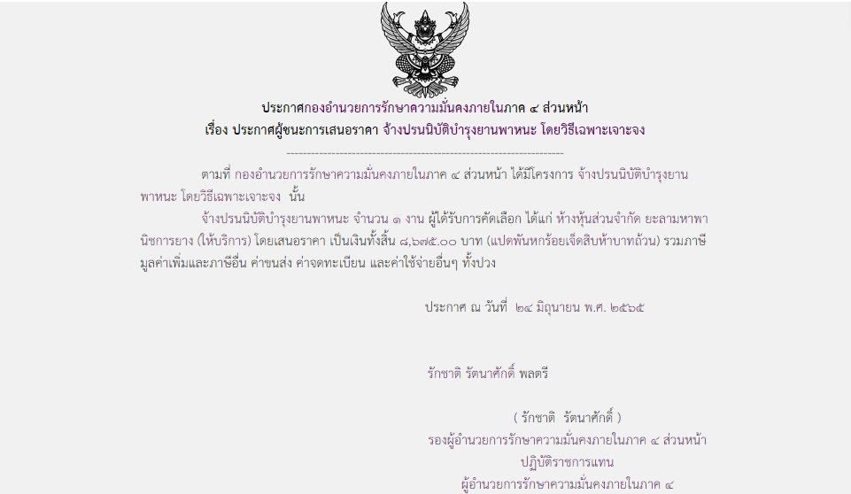 ประกาศผู้ชนะการเสนอราคา จ้างปรนนิบัติบำรุงยานพาหนะ โดยวิธีเฉพาะเจาะจง
