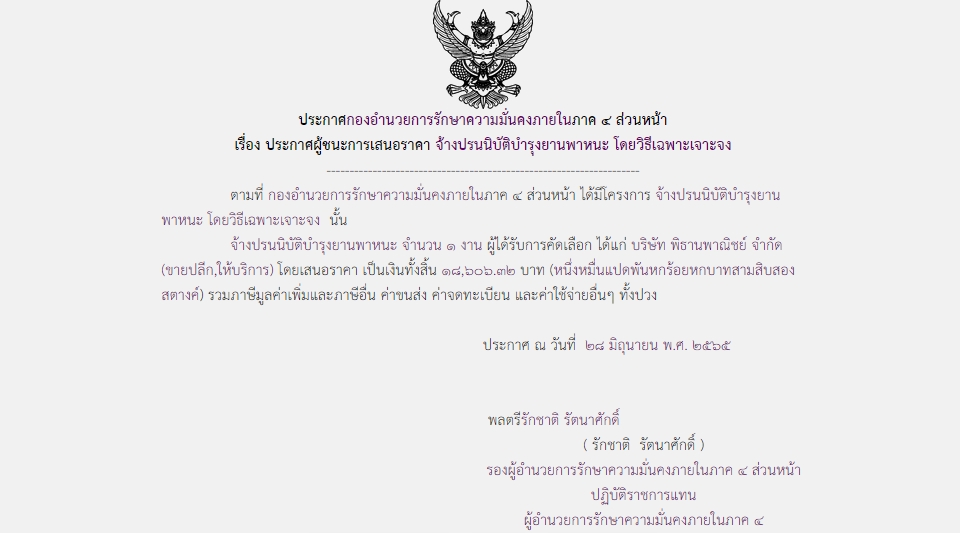 ประกาศผู้ชนะการเสนอราคา จ้างปรนนิบัติบำรุงยานพาหนะ โดยวิธีเฉพาะเจาะจง