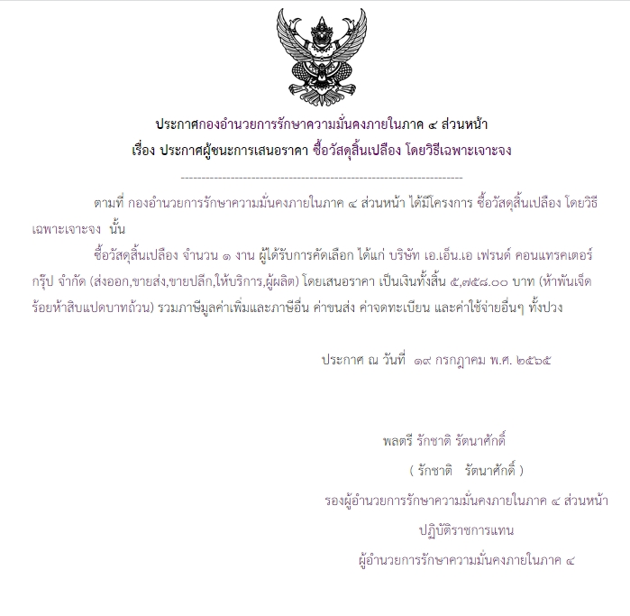 ประกาศผู้ชนะการเสนอราคา ซื้อวัสดุสิ้นเปลือง โดยวิธีเฉพาะเจาะจง