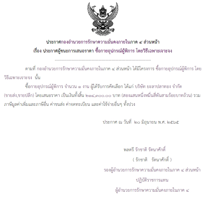 ประกาศผู้ชนะการเสนอราคา ซื้อกายอุปกรณ์ผู้พิการ โดยวิธีเฉพาะเจาะจง