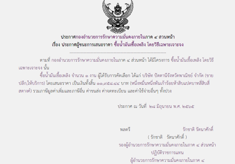 ประกาศผู้ชนะการเสนอราคา ซื้อน้ำมันเชื้อเพลิง โดยวิธีเฉพาะเจาะจง