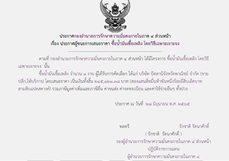ประกาศผู้ชนะการเสนอราคา ซื้อน้ำมันเชื้อเพลิง โดยวิธีเฉพาะเจาะจง