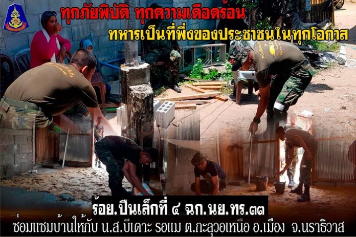 กองร้อยปืนเล็กที่ 4 หน่วยเฉพาะกิจนาวิกโยธินกองทัพเรือที่ 33 ร่วมกับ ประชาชน บ้านบางมะนาวฯ ซ่อมแซมบ้านให้กับ นางสาวบีเดาะ รอแม อาศัยอยู่บ้านเลขที่ 41/4 หมู่ที่ 1 ตำบลกะลุวอเหนือ อำเภอเมือง จังหวัดนราธิวาส ซึ่งเป็นผู้ที่ประสบปัญหาเดือดร้อนด้านที่อยู่อาศัย โดยได้รับงบประมาณสนับสนุนในการซ่อมแซมบ้านจากกระทรวงการพัฒนาสังคมและความมั่นคงของมนุษย์ (พม.) การดำเนินการซ่อมแซมบ้าน นางสาวบีเดาะ รอแมคาดว่าจะแล้วเสร็จและสามารถส่งมอบให้ในวันนี้ (3 กันยายน 2563)