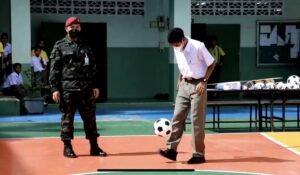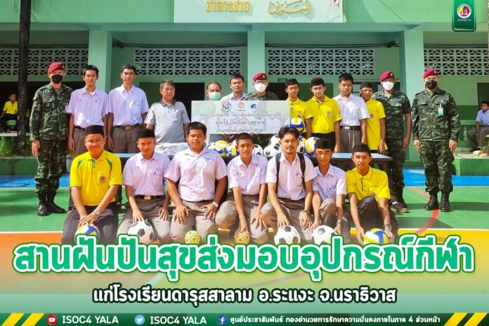 วันนี้ 25 กรกฎาคม 2565 ณ โรงเรียนดารุสสาลาม ตำบลตันหยงมัส อำเภอระแงะ จังหวัดนราธิวาส พันโท ยศศักดิ์ เขียวแก้ว ผู้บังคับชุดควบคุมที่ 954 หน่วยเฉพาะกิจสันติสุข ส่งมอบอุปกรณ์กีฬาให้กับนักเรียน ซึ่งได้รับการสนับสนุนจากอุปกรณ์กีฬาจากชมรมสานฝันปันสุข โดยบริษัท อิตาเลี่ยนไทย ดีเวล๊อปเมนต์ และชมรมผู้ประกอบการนำเข้าส่งออกด้วยความถูกต้อง เพื่อมอบให้กับสถานศึกษาในพื้นที่จังหวัดชายแดนภาคใต้ เสริมสร้างความสัมพันธ์อันดีให้กับเยาวชนในพื้นที่จังหวัดชายแดนภาคใต้ ตลอดจนสร้างความสามัคคี และกระตุ้นให้เยาวชนห่างไกลจากยาเสพติด โดยมีคณะครู และนักเรียนร่วมรับมอบอุปกรณ์กีฬาในครั้งนี้