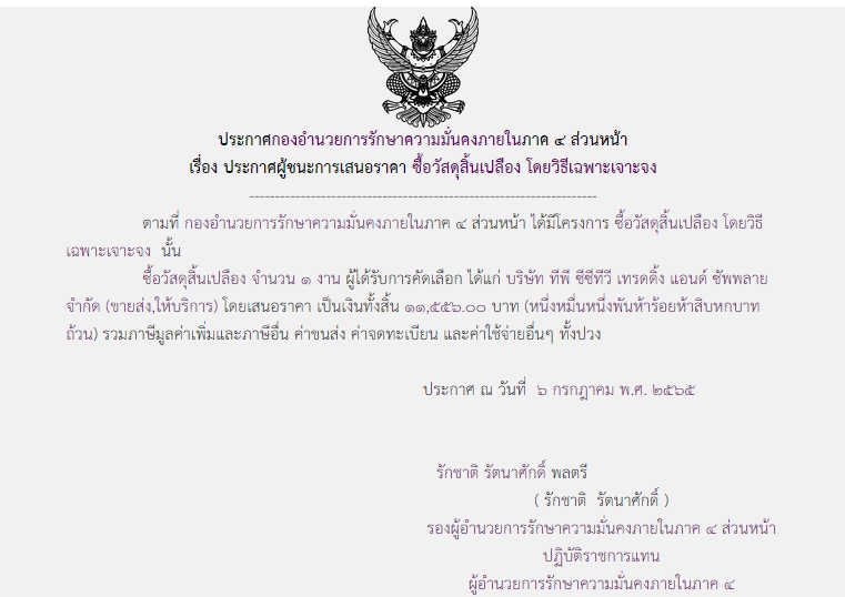 ประกาศผู้ชนะการเสนอราคา ซื้อวัสดุสิ้นเปลือง โดยวิธีเฉพาะเจาะจง