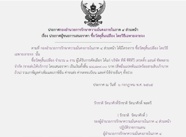ประกาศผู้ชนะการเสนอราคา ซื้อวัสดุสิ้นเปลือง โดยวิธีเฉพาะเจาะจง