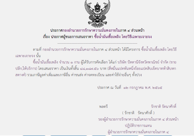 ประกาศผู้ชนะการเสนอราคา ซื้อน้ำมันเชื้อเพลิง โดยวิธีเฉพาะเจาะจง