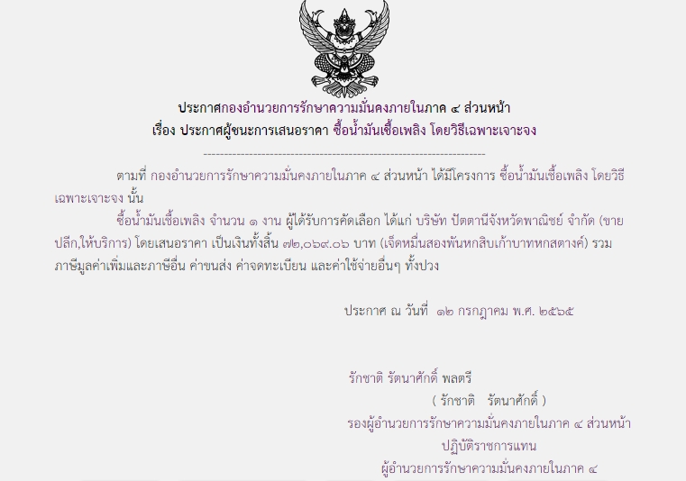 ประกาศผู้ชนะการเสนอราคา ซื้อน้ำมันเชื้อเพลิง โดยวิธีเฉพาะเจาะจง