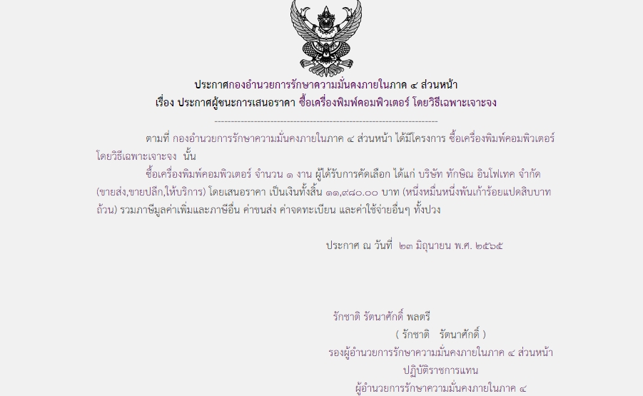 ประกาศผู้ชนะการเสนอราคา ซื้อเครื่องพิมพ์คอมพิวเตอร์ โดยวิธีเฉพาะเจาะจง