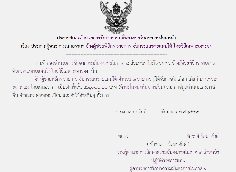 ประกาศผู้ชนะการเสนอราคา จ้างผู้ช่วยพิธีกร รายการ จับกระแสชายแดนใต้ โดยวิธีเฉพาะเจาะจง