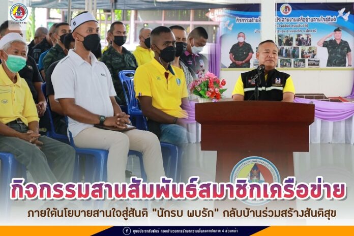 กองสานใจสู่สันติ ศูนย์สันติวิธี บ้านควนดิน ตำบลบ่อทอง อำเภอหนองจิก จังหวัดปัตตานี พลโท ธิรา แดหวา รองผู้อำนวยการรักษาความมั่นคงภายในภาค 4 ส่วนหน้า/ ผู้อำนวยการศูนย์สันติวิธี จัดกิจกรรมพบปะสานสัมพันธ์สมาชิกเครือข่ายผู้ร่วมเสริมสร้างสันติสุข ภายใต้นโยบายสานใจสู่สันติสุข ด้วยกองอำนวยการรักษาความมั่นคงภายในภาค 4 ส่วนหน้า โดยศูนย์สันติวิธี ดำเนินโครงการสานใจสู่สันติ (รายอฮัจญ์) สานต่อข้อเรียกร้องจากประชาชนเรื่องการสร้างสันติสุขปราศจากความรุนแรง สืบเนื่องจากเดือนรอมฎอนที่ผ่านต่อเนื่องจนถึงปัจจุบัน เพื่อเปิดโอกาสให้กับประชาชนที่คิดเห็นต่างจากรัฐ ที่ต้องหลบหนีห่างไกลบ้าน ได้มีโอกาสกลับมาอยู่กับครอบครัว อีกทั้งเพื่อเปิดพื้นที่ในการพูดคุยเสริมสร้างความเข้าใจระหว่างกัน โดยผ่านกลไกของผู้ประสานงานในระดับพื้นที่ทุกภาคส่วน รวมถึงการประชาสัมพันธ์รณรงค์โครงการสานใจสู่สันติอย่างต่อเนื่อง โดยครั้งนี้มีประชาชนผู้คิดเห็นต่างจากรัฐสมัครใจเข้าร่วมโครงการสานใจสู่สันติ จำนวน 67 ราย จากการที่รัฐได้เปิดโอกาส และอำนวยความสะดวกให้กับพี่น้องประชาชนเหล่านี้ได้มีโอกาสกลับมาต่อสู้ตามกระบวนการยุติธรรมของรัฐอย่างเป็นธรรมภายใต้บริบท “นักรบ พบรัก” กลับบ้านร่วมกันสร้างสันติสุข จัดขึ้น ระหว่าง วันที่ 29 -30 กรกฎาคม 2565 โดยมี ผู้บังคับหน่วยเฉพาะกิจกรมทหารพรานในพื้นที่, ผู้บังคับกองร้อยทหารพราน รวมถึงผู้นำท้องที่ ผู้นำท้องถิ่น ผู้นำศาสนา สมาชิกเครือข่ายสานใจสู่สันติ ในพื้นที่ 3 จังหวัดชายแดนภาคใต้ เข้าร่วมในกิจกรรม