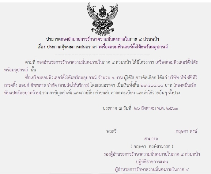 จัดซื้อ จัดจ้างประกาศผู้ชนะการเสนอราคา ประกาศผู้ชนะการเสนอราคา เครื่องคอมพิวเตอร์ตั้งโต๊ะพร้อมอุปกรณ์ (27,800.00) September 4, 2020 1042 Share Facebook Twitter Google+ Telegram LINE สบป.กอ.รมน.ภาค 4 สน.