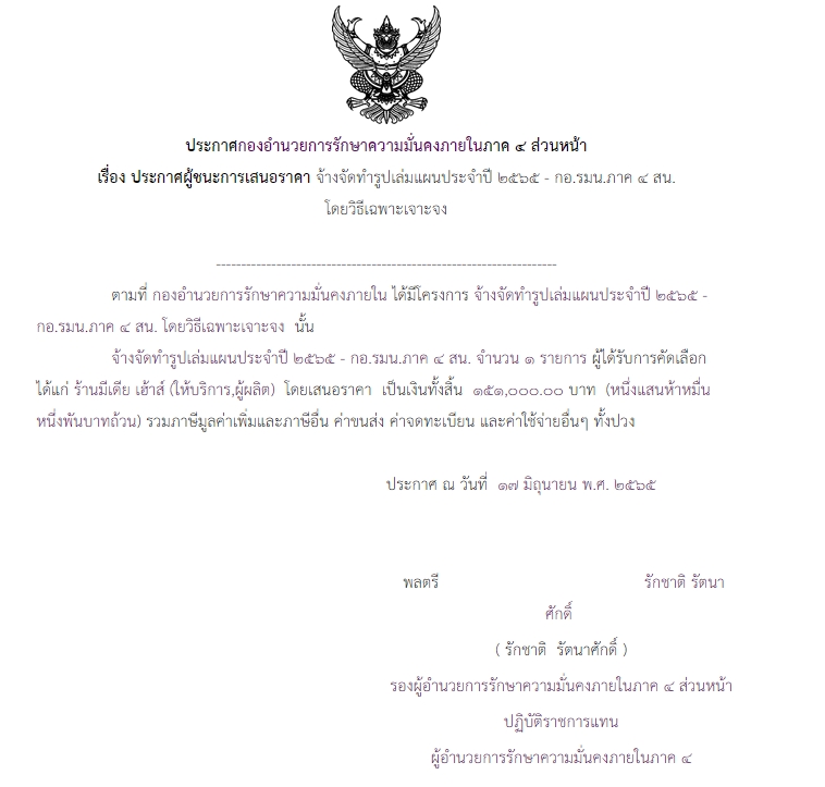 จัดซื้อ จัดจ้างประกาศผู้ชนะการเสนอราคา ประกาศผู้ชนะการเสนอราคา จ้างจัดทำรูปเล่มแผนประจำปี – กอ.รมน.ภาค 4 สน. โดยวิธีเฉพาะเจาะจง ( 151,000.00 บาท ) July 31, 2022 425 Share Facebook Twitter Google+ Telegram LINE