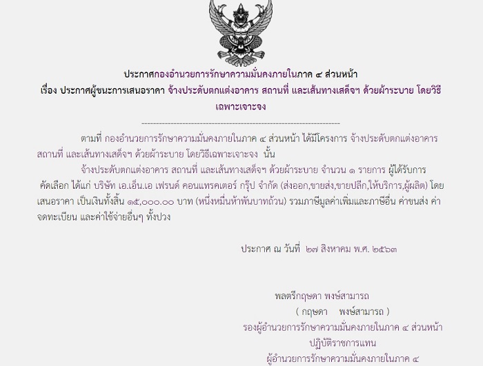 ประกาศผู้ชนะการเสนอราคา จ้างประดับตกแต่งอาคาร สถานที่ และเส้นทางเสด็จฯ ด้วยผ้าระบาย โดยวิธีเฉพาะเจาะจง (15,000.00)
