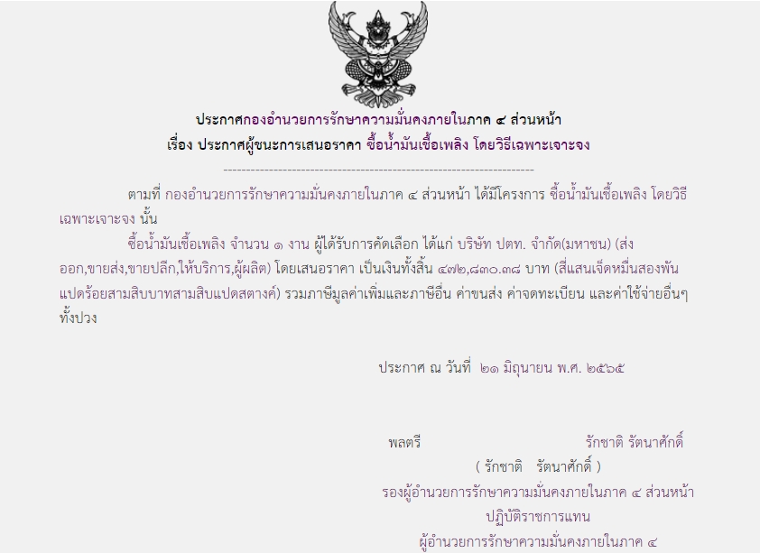 ประกาศผู้ชนะการเสนอราคา ซื้อน้ำมันเชื้อเพลิง โดยวิธีเฉพาะเจาะจง ( 472,830.38 บาท )