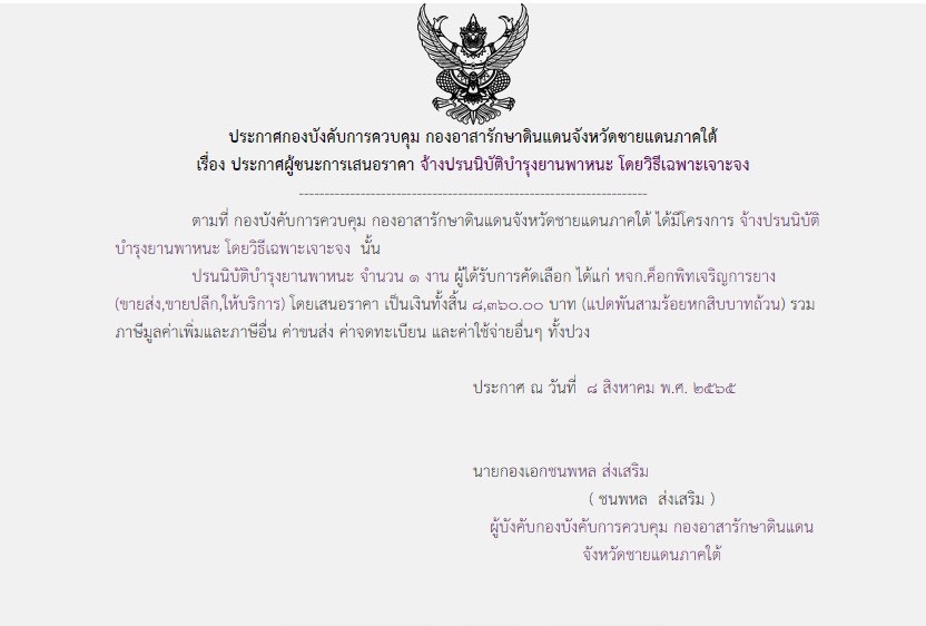 ประกาศผู้ชนะการเสนอราคา จ้างปรนนิบัติบำรุงยานพาหนะ โดยวิธีเฉพาะเจาะจง