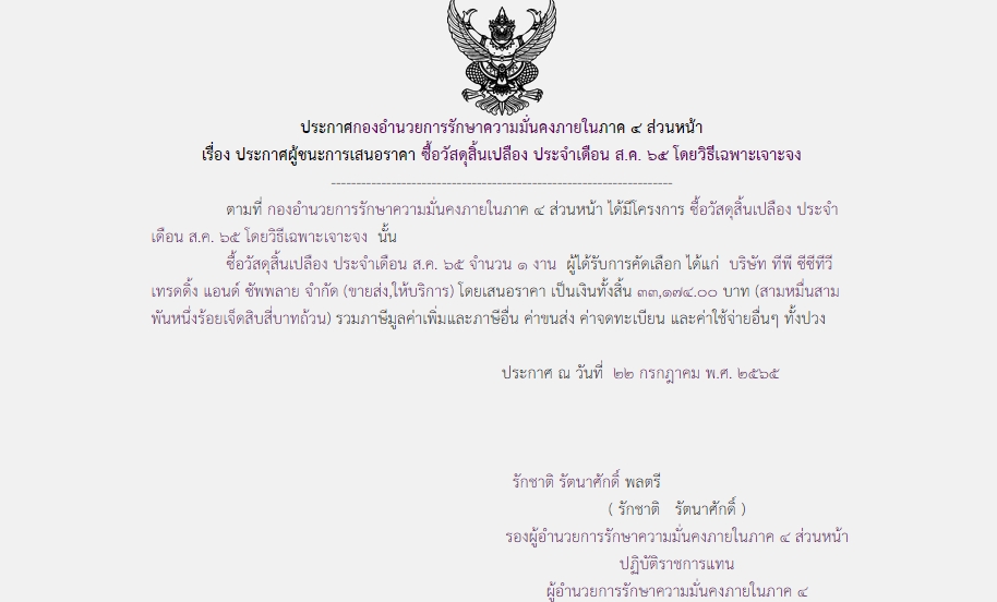ประกาศผู้ชนะการเสนอราคา ซื้อวัสดุสิ้นเปลือง ประจำเดือน ส.ค. ๖๕ โดยวิธีเฉพาะเจาะจง