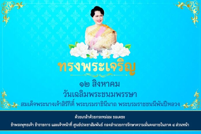 ประชาสัมพันธ์ข่าวประชาสัมพันธ์ 12 สิงหาคม 2565 วันเฉลิมพระชนมพรรษา สมเด็จพระนางเจ้าสิริกิติ์ พระบรมราชินีนาถ พระบรมราชชนนีพันปีหลวง August 12, 2022 1920 Share Facebook Twitter Google+ Telegram LINE ขอพระองค์ทรงพระเจริญ ด้วยเกล้าด้วยกระหม่อม ขอเดชะ ข้าพระพุทธเจ้า ข้าราชการและเจ้าหน้าที่ ศูนย์ประชาสัมพันธ์ กองอำนวยการรักษาความมั่นคงภายในภาค 4 ส่วนหน้า ทรงพระเจริญ ศูนย์ประชาสัมพันธ์กองอำนวยการรักษาความมั่นคงภายในภาค4ส่วนหน้า