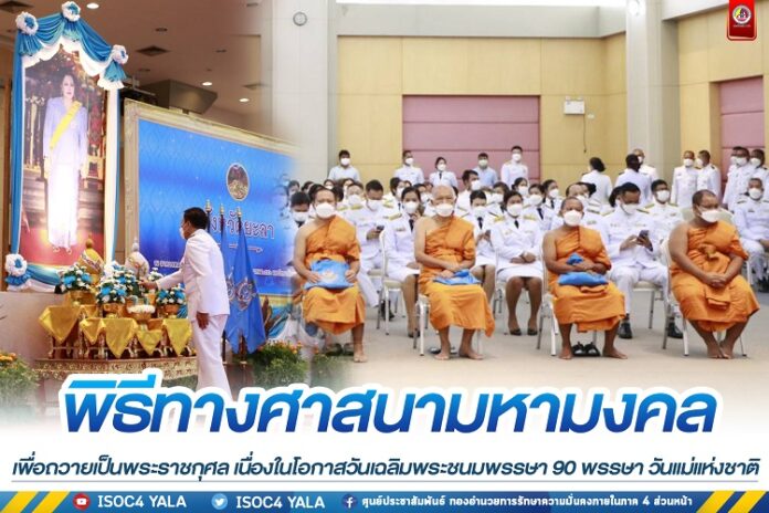โดยในพิธี นายภิรมย์ นิลทยา ผู้ว่าราชการจังหวัดยะลา ได้เปิดกรวยกระทงดอกไม้ธูปเทียนแพ ถวายราชสักการะเบื้องหน้าบรมพระฉายาลักษณ์สมเด็จพระนางเจ้าสิริกิติ์ พระบรมราชินีนาถ พระบรมราชชนนีพันปีหลวง จุดธูปเทียนบูชาพระรัตนตรัย จากนั้นเริ่มพิธีทางศาสนามหามงคล 4 ศาสนา ประกอบด้วยศาสนาพุทธ พระสงฆ์ในพิธี 10 รูป เจริญพระพุทธมนต์ถวายพระราชกุศล,ศาสนาอิสลาม ผู้นำศาสนาอิสลามประกอบพิธีดุอาร์ขอพร ,ศาสนาคริสต์ ผู้นำศาสนาคริสต์ประกอบพิธีอธิษฐานภาวนาขอพร และศาสนาพราหมณ์ – ฮินดู พราหมณ์สวดถวายพระพร ขอให้พระองค์ทรงมีพลานามัยที่สมบูรณ์และมีอายุยืนนาน เป็นร่มโพธิ์ร่มไทรของปวงชนชาวไทยทุกคน