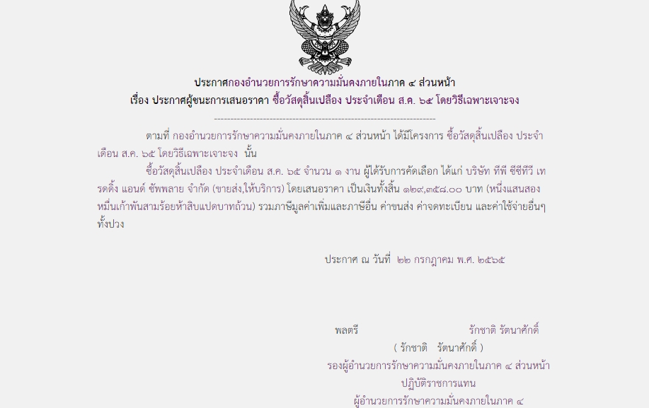 ประกาศผู้ชนะการเสนอราคา ซื้อวัสดุสิ้นเปลือง ประจำเดือน ส.ค. ๖๕ โดยวิธีเฉพาะเจาะจง