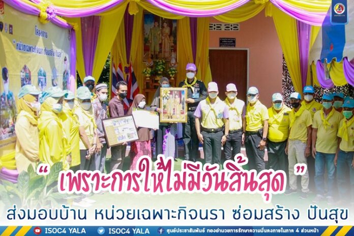 สำหรับโครงการ “หน่วยเฉพาะกิจนรา ซ่อมสร้าง ปันสุข” ประจำปี 2565 ตามที่กองอำนวยการรักษาความมั่นคงภายในภาค 4 ส่วนหน้า ได้ดำเนินโครงการเพื่อช่วยเหลือพี่น้องประชาชน จึงได้มอบหมายให้หน่วยเฉพาะกิจนราธิวาส ดำเนินการสนับสนุนงบประมาณให้กับหน่วยเฉพาะกิจกรมทหารพรานที่ 48 พร้อมด้วยชุดปฏิบัติการกิจการพลเรือนกองร้อยทหารพรานที่ 4814 และส่วนที่เกี่ยวข้อง ดำเนินการคัดเลือกกลุ่มเป้าหมายผ่านสภาประชาธิปไตยตำบล เพื่อให้ความช่วยเหลือประชาชนที่รับความเดือดร้อนด้านที่พักอาศัย ด้วยการซ่อมสร้างบ้านให้กับที่มีฐานะยากจน คือ ครอบครัวของ นางกีเยาะ อาแวเง๊าะ โดยรับความร่วมมือจากส่วนราชการ ผู้นำท้องที่ ผู้นำท้องถิ่น และพี่น้องประชาชนในพื้นที่ ในการบริจาควัสดุก่อสร้าง และร่วมแรงร่วมใจในการก่อสร้างบ้านให้แล้วเสร็จและดำเนินการส่งมอบบ้านให้ครอบครัวดังกล่าว