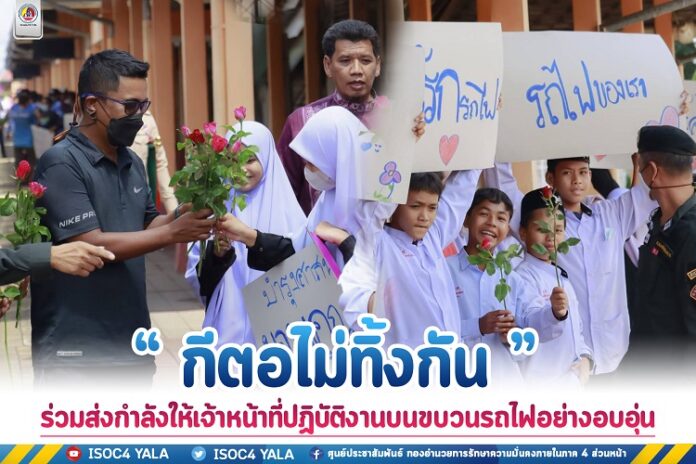 จากกรณีเหตุกลุ่มผู้ก่อเหตุรุนแรงใช้อาวุธปืนสงครามยิงขบวนรถเร็วที่ 172 กรุงเทพฯ – สุไหงโก-ลก เมื่อวันที่ 4 สิงหาคม 2565 ที่ผ่านมา ในเหตุการณ์ครั้งนั้น พนักงานรถไฟและเจ้าหน้าที่ทุกนายสามารถแก้ไขสถานการณ์เฉพาะหน้าได้อย่างดี ส่งผลให้ประชาชนไม่ได้รับบาดแต่อย่างใด วันนี้ (14 ส.ค. 65) เวลา 13.50 น. เมื่อขบวนรถไฟ 172 กรุงเทพฯ – สุไหงโก-ลก มาถึงที่สถานีรถไฟยะลา อำเภอเมือง จังหวัดยะลา เครือข่ายกีตอไม่ทิ้งกัน ประชาชนในพื้นที่จังหวัดชายแดนภาคใต้ และตัวแทนนักเรียนจากโรงเรียนสอนศาสนา กว่า 30 คน ร่วมกันชูป้ายข้อความแสดงความห่วงใย ให้กำลัง พร้อมทั้งนำดอกกุหลาบ มอบให้เจ้าหน้าที่ ตามโครงการกีตอไม่ทิ้งกันให้กำลังใจรถไฟ เพื่อสร้างขวัญและกำลังใจให้กับพนักงานรถไฟและเจ้าหน้าที่ที่ปฏิบัติหน้าที่บนรถไฟ ทำให้บรรยากาศบนขบวนรถไฟสายนี้เป็นไปอย่างอบอุ่น และอบอวลไปด้วยความรักความห่วงใยที่คนในพื้นที่จังหวัดชายแดนภาคใต้มีให้กันและกัน