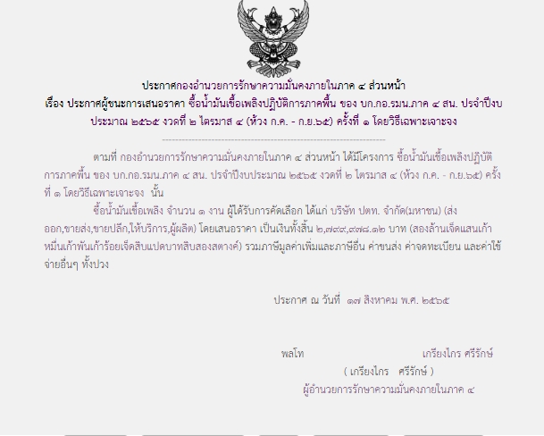 จัดซื้อ จัดจ้างประกาศผู้ชนะการเสนอราคา ประกาศผู้ชนะการเสนอราคา ซื้อน้ำมันเชื้อเพลิงปฏิบัติภาคพื้น ของ บก.กอ.รมน.ภาค ๔ สน. ประจำปีงบประมาณ ๒๕๖๕ งวดที่ ๒ ไตรมาศ ๔ (ห้วง ก.ค. – ก.ย.๖๕) ครั้งที่ ๑ โดยวิธีเฉพาะเจาะจง August 17, 2022 377 Share Facebook Twitter Google+ Telegram LINE