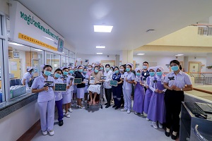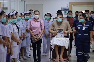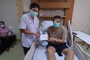 โดย จ่าสิบเอก พิษณุ พันเต และครอบครัวได้ถือโอกาสนี้มอบของที่ระลึก เป็นโปสการ์ดเขียนคำขอบคุณ ทีมแพทย์ พยาบาล และเจ้าหน้าที่ด้วยข้อความว่า “ขอบคุณทีมแพทย์ พยาบาล และเจ้าหน้าที่โรงพยาบาล ทุกๆท่านที่มีส่วนในการรักษาพยาบาล ดูแลกระผมตลอดระยะเวลา 1 เดือนที่อยู่ที่นี่ ขอบคุณในการดูแลรักษา ขอบคุณคุณพยาบาลที่ใจดีทุกๆท่าน” พร้อมกันนี้ได้ร่วมบันทึกภาพเพื่อเป็นที่ระลึกอีกด้วย ซึ่งทางทีมแพทย์ และพยาบาล ก็ได้กล่าวแสดงความยินดี และดีใจที่ผู้ป่วยในความดูแลมีอาการดีขึ้นอย่างต่อเนื่อง ก่อน จ่าสิบเอก พิษณุ พันเต (ผู้ป่วย) ครอบครัว และผู้ติดตาม จะได้เดินทางเพื่อไปขึ้นเครื่องบิน C-130 ของกองทัพอากาศ จากสนามบินบ่อทอง ปลายทางท่าอากาศยานทหาร (บน.6) ดอนเมือง กรุงเทพฯ โดยก่อนขึ้นเครื่องนั้นมีกำลังพลจากหน่วยบินทหารบกอโณทัยมาคอยส่งกำลังใจให้ จ่าสิบเอก พิษณุ พันเต ขอให้มีกำลังใจที่ดี และกลับมาปฏิบัติงานร่วมกันอีกครั้ง