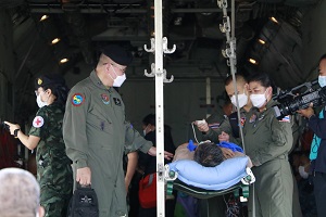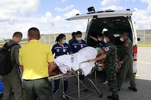วันนี้ (18 สิงหาคม 2565) เวลา 08.30 น. ที่ อาคารเฉลิมพระบารมี ชั้น 8 โรงพยาบาลสงขลานครินทร์ อำเภอหาดใหญ่ จังหวัดสงขลา ทีมแพทย์ พยาบาล และเจ้าหน้าที่โรงพยาบาลสงขลานครินทร์ ร่วมส่ง และให้กำลังใจ จ่าสิบเอก พิษณุ พันเต ช่างประจำเครื่องบิน ร้อยบินปีกหมุนที่ 9 กองพันบินที่ 9 ซึ่งได้รับบาดเจ็บจากเหตุ เฮลิคอปเตอร์ลงจอดฉุกเฉินในพื้นที่ อำเภอเทพา จังหวัดสงขลา เมื่อวันที่ 15 กรกฎาคม 2565 ที่ผ่านมา ขณะนี้มีอาการดีขึ้นตามลำดับ คณะแพทย์โรงพยาบาลสงขลานครินทร์จึงได้ส่งผู้ป่วย เพื่อไปรักษาตัวต่อที่โรงพยาบาลพระมงกุฎเกล้า แขวงทุ่งพญาไท เขตราชเทวี กรุงเทพมหานคร เพื่อรักษาเฉพาะทางต่อไป